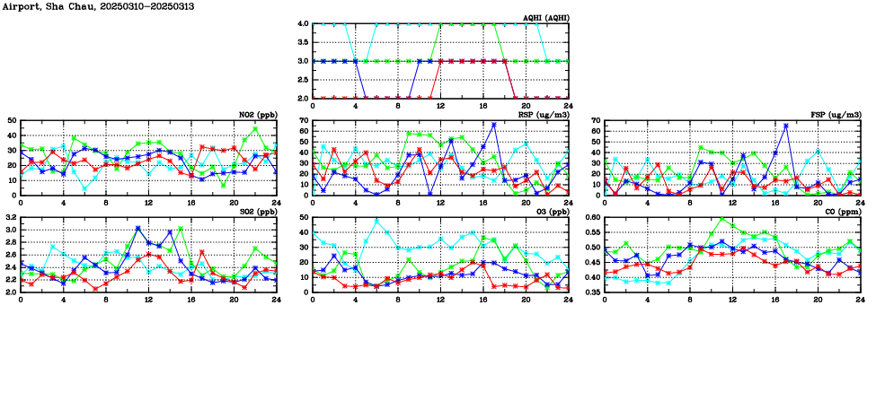 | Air Quality Data Time Series in Airport, Sha Chau (2025/03/13) | ( Line colors: Day -3 Day -2 Day -1 Current day ) | 2D Map Current AQHI |