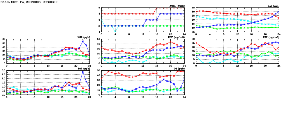 | Air Quality Data Time Series in Sham Shui Po (2025/03/09) | ( Line colors: Day -3 Day -2 Day -1 Current day ) | 2D Map Current AQHI |