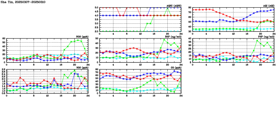 | Air Quality Data Time Series in Sha Tin (2025/03/10) | ( Line colors: Day -3 Day -2 Day -1 Current day ) | 2D Map Current AQHI |
