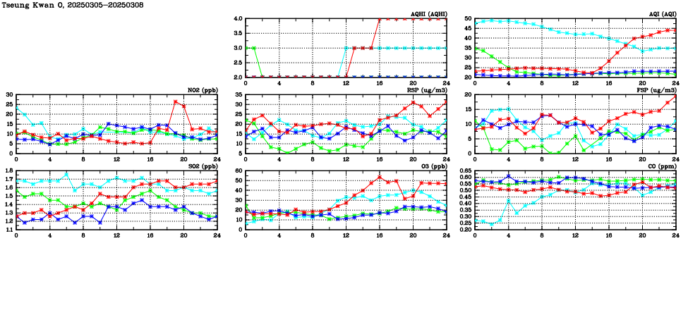 | Air Quality Data Time Series in Tseung Kwan O (2025/03/08) | ( Line colors: Day -3 Day -2 Day -1 Current day ) | 2D Map Current AQHI |