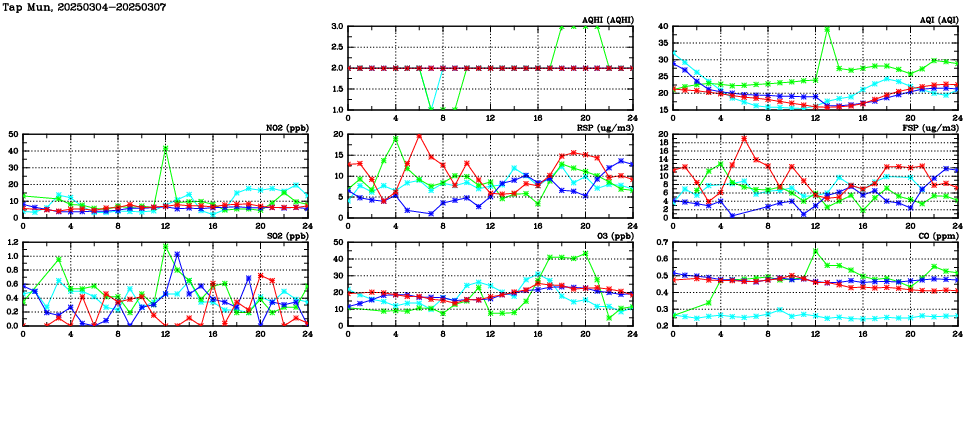 | Air Quality Data Time Series in Tap Mun (2025/03/07) | ( Line colors: Day -3 Day -2 Day -1 Current day ) | 2D Map Current AQHI |
