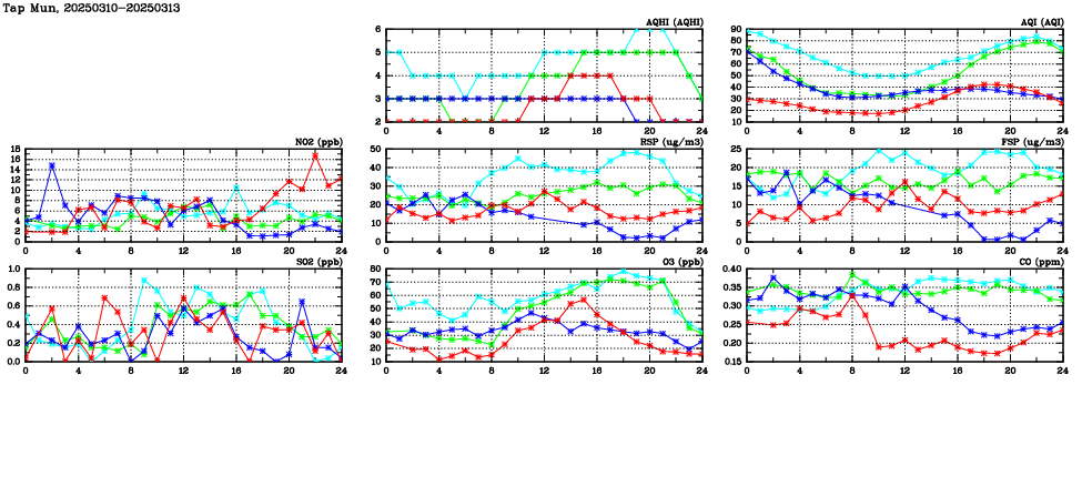 | Air Quality Data Time Series in Tap Mun (2025/03/13) | ( Line colors: Day -3 Day -2 Day -1 Current day ) | 2D Map Current AQHI |