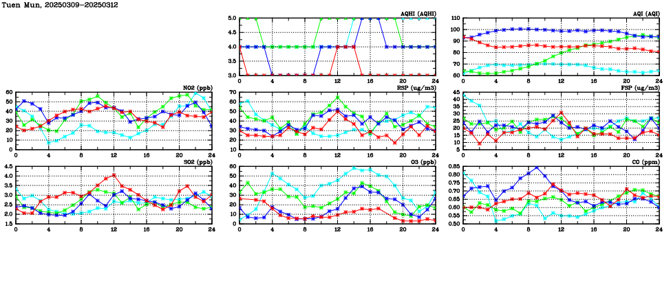 | Air Quality Data Time Series in Tuen Mun (2025/03/12) | ( Line colors: Day -3 Day -2 Day -1 Current day ) | 2D Map Current AQHI |