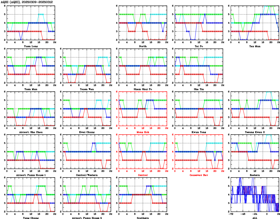 | Air Quality Data Time Series for AQHI (2025/03/12) | ( Line colors: Day -3 Day -2 Day -1 Current day ) | 2D Map Current AQHI |