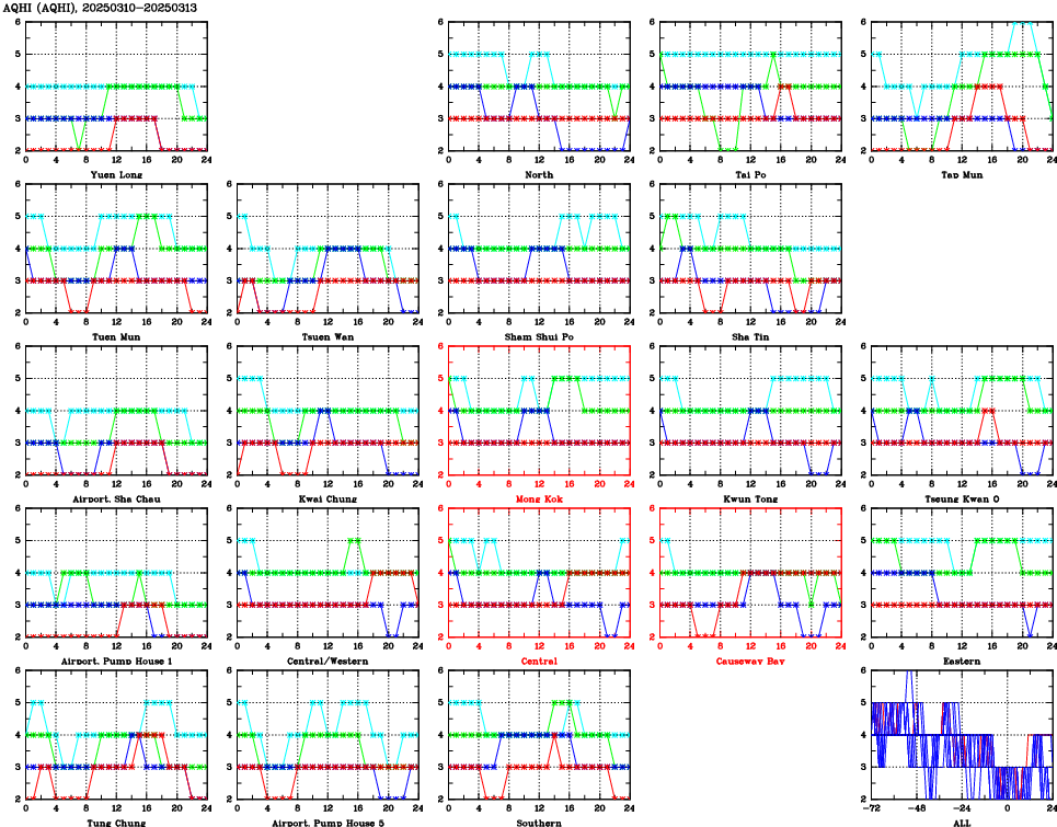 | Air Quality Data Time Series for AQHI (2025/03/13) | ( Line colors: Day -3 Day -2 Day -1 Current day ) | 2D Map Current AQHI |