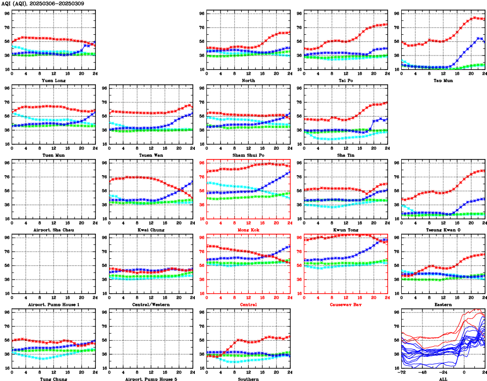 | Air Quality Data Time Series for AQI (2025/03/09) | ( Line colors: Day -3 Day -2 Day -1 Current day ) | 2D Map Current AQHI |