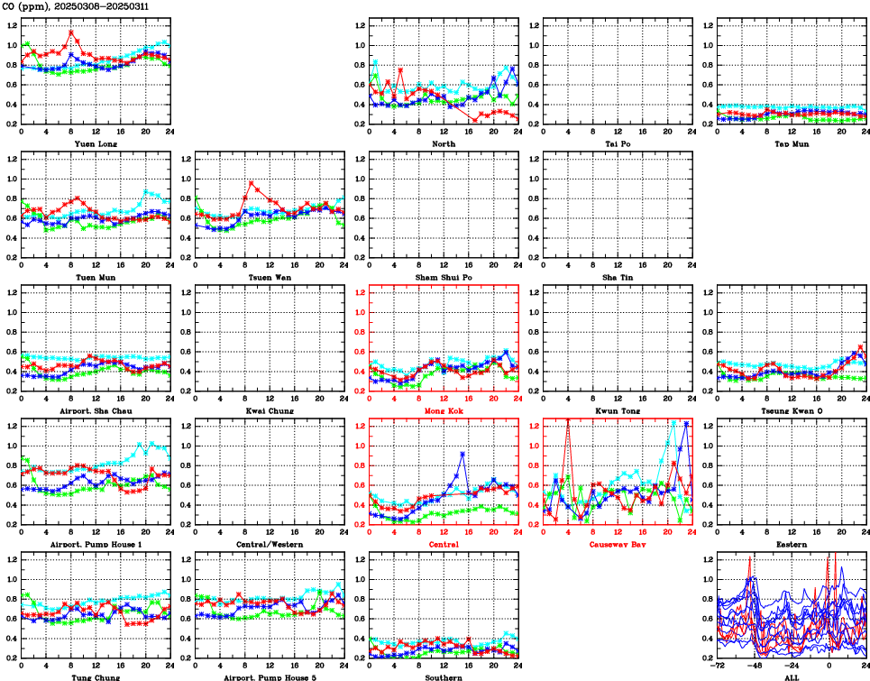| Air Quality Data Time Series for CO (2025/03/11) | ( Line colors: Day -3 Day -2 Day -1 Current day ) | 2D Map Current AQHI |