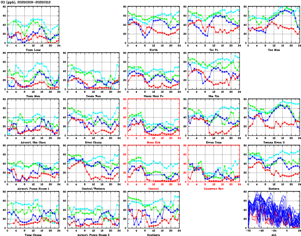 | Air Quality Data Time Series for O3 (2025/03/12) | ( Line colors: Day -3 Day -2 Day -1 Current day ) | 2D Map Current AQHI |