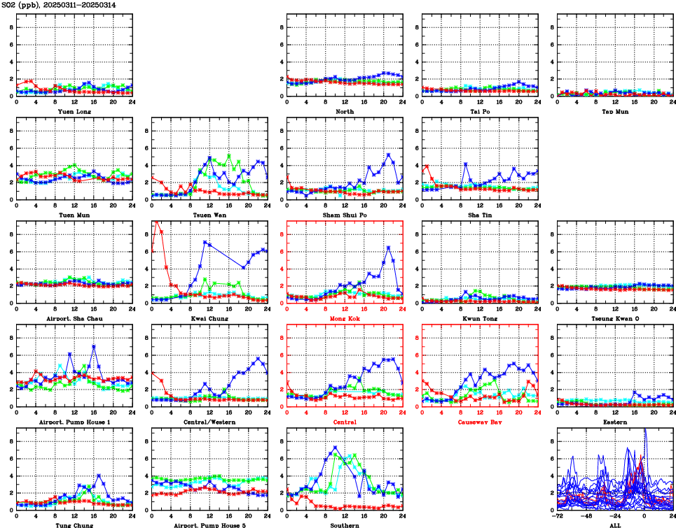 | Air Quality Data Time Series for SO2 (2025/03/14) | ( Line colors: Day -3 Day -2 Day -1 Current day ) | 2D Map Current AQHI |