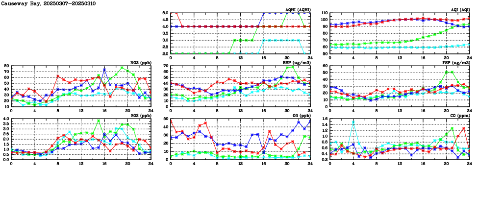 | Air Quality Data Time Series in Causeway Bay (2025/03/10) | ( Line colors: Day -3 Day -2 Day -1 Current day ) | 2D Map Current AQHI |