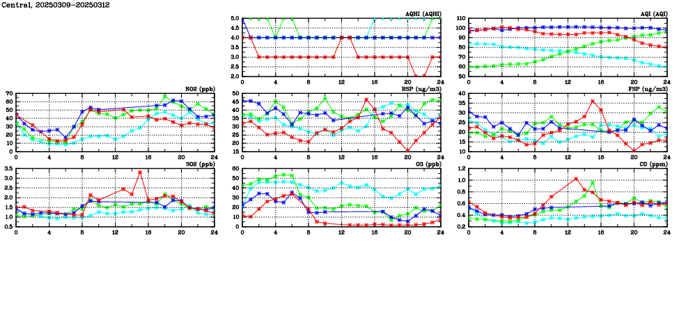 | Air Quality Data Time Series in Central (2025/03/12) | ( Line colors: Day -3 Day -2 Day -1 Current day ) | 2D Map Current AQHI |
