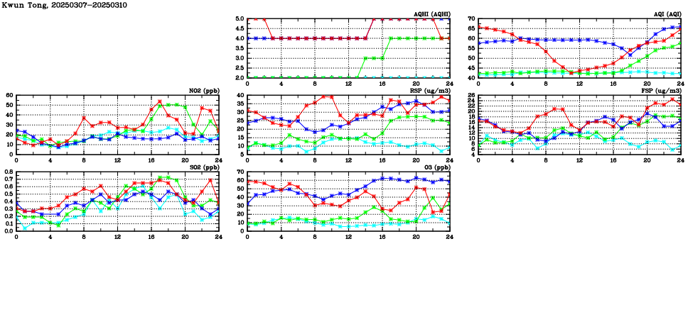 | Air Quality Data Time Series in Kwun Tong (2025/03/10) | ( Line colors: Day -3 Day -2 Day -1 Current day ) | 2D Map Current AQHI |