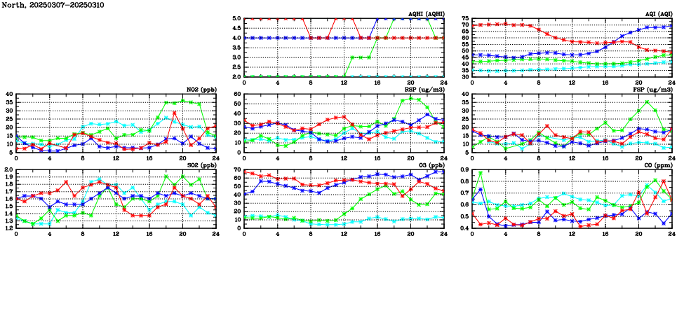 | Air Quality Data Time Series in North (2025/03/10) | ( Line colors: Day -3 Day -2 Day -1 Current day ) | 2D Map Current AQHI |