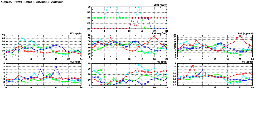 | Air Quality Data Time Series in Airport, Pump House 1 (2025/03/14) | ( Line colors: Day -3 Day -2 Day -1 Current day ) | 2D Map Current AQHI |