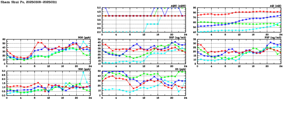 | Air Quality Data Time Series in Sham Shui Po (2025/03/11) | ( Line colors: Day -3 Day -2 Day -1 Current day ) | 2D Map Current AQHI |