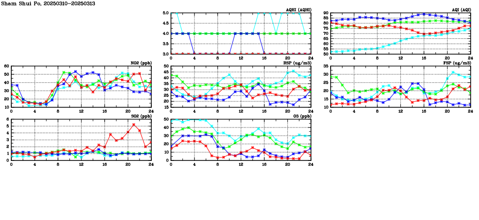 | Air Quality Data Time Series in Sham Shui Po (2025/03/13) | ( Line colors: Day -3 Day -2 Day -1 Current day ) | 2D Map Current AQHI |