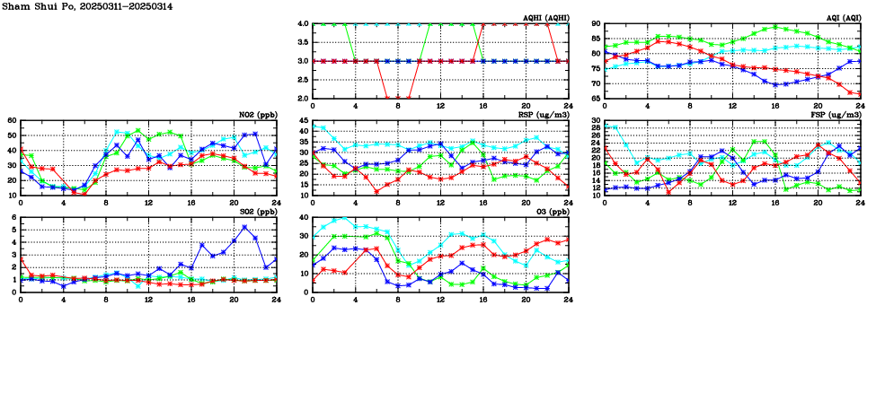 | Air Quality Data Time Series in Sham Shui Po (2025/03/14) | ( Line colors: Day -3 Day -2 Day -1 Current day ) | 2D Map Current AQHI |