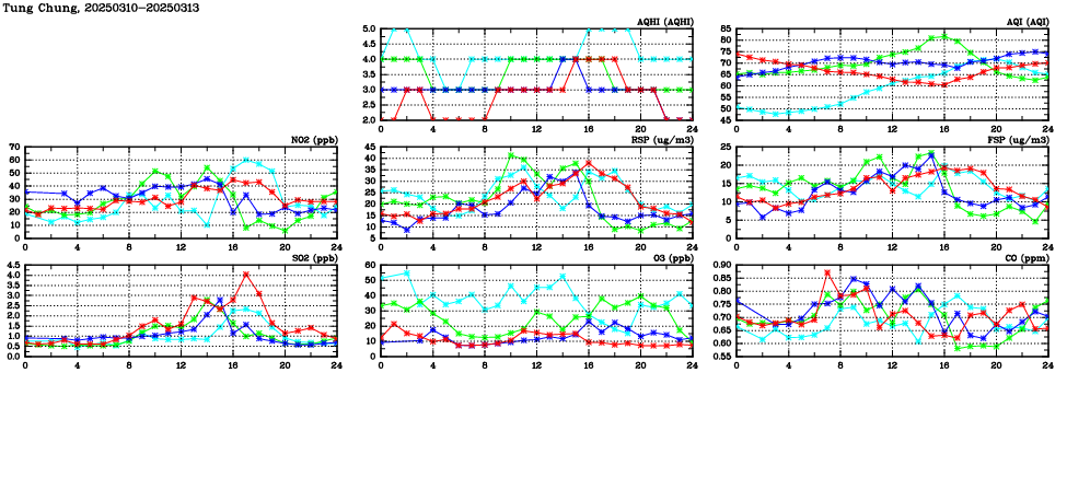 | Air Quality Data Time Series in Tung Chung (2025/03/13) | ( Line colors: Day -3 Day -2 Day -1 Current day ) | 2D Map Current AQHI |