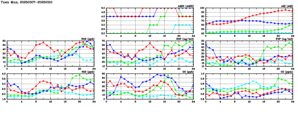 | Air Quality Data Time Series in Tuen Mun (2025/03/10) | ( Line colors: Day -3 Day -2 Day -1 Current day ) | 2D Map Current AQHI |