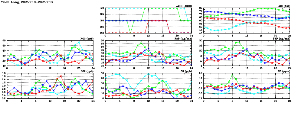 | Air Quality Data Time Series in Yuen Long (2025/03/13) | ( Line colors: Day -3 Day -2 Day -1 Current day ) | 2D Map Current AQHI |