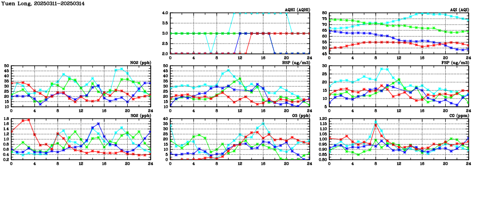 | Air Quality Data Time Series in Yuen Long (2025/03/14) | ( Line colors: Day -3 Day -2 Day -1 Current day ) | 2D Map Current AQHI |