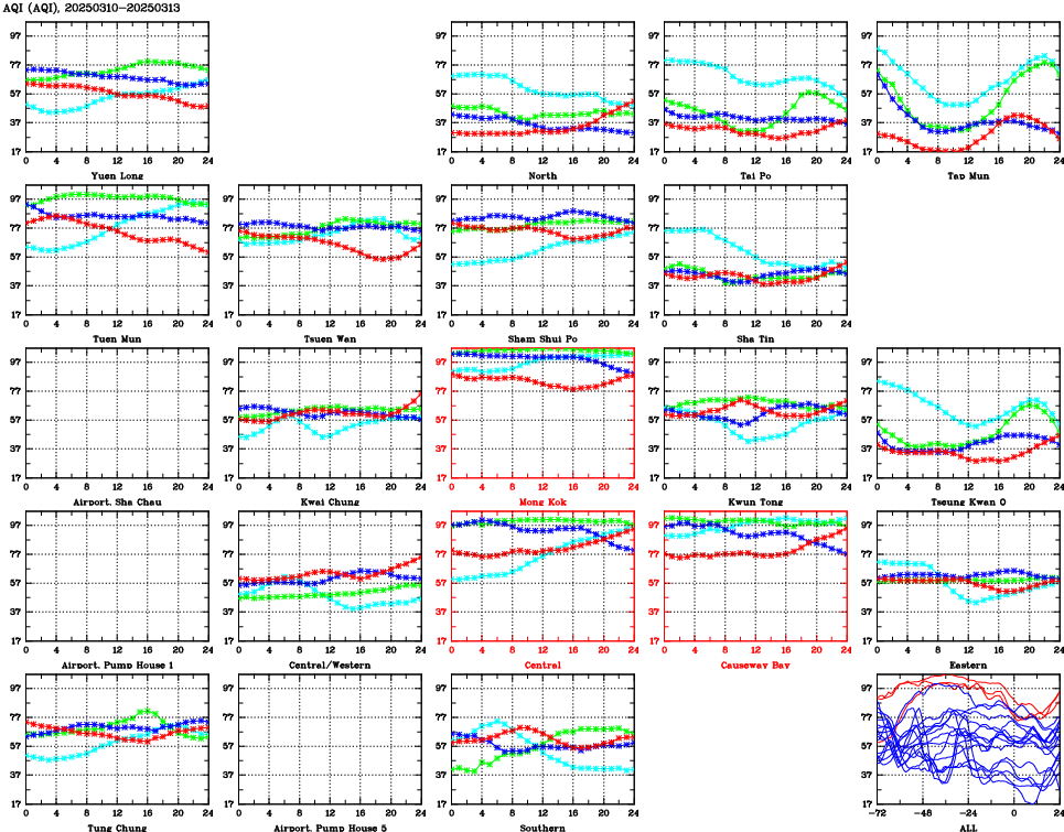 | Air Quality Data Time Series for AQI (2025/03/13) | ( Line colors: Day -3 Day -2 Day -1 Current day ) | 2D Map Current AQHI |