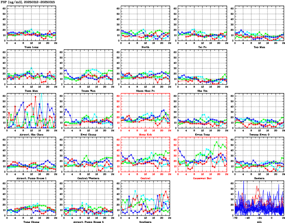 | Air Quality Data Time Series for FSP (2025/03/15) | ( Line colors: Day -3 Day -2 Day -1 Current day ) | 2D Map Current AQHI |