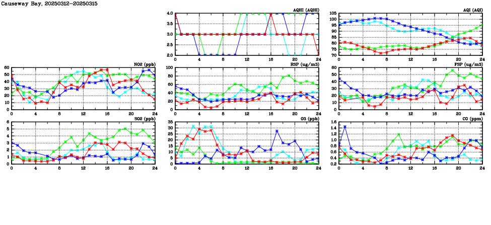 | Air Quality Data Time Series in Causeway Bay (2025/03/15) | ( Line colors: Day -3 Day -2 Day -1 Current day ) | 2D Map Current AQHI |