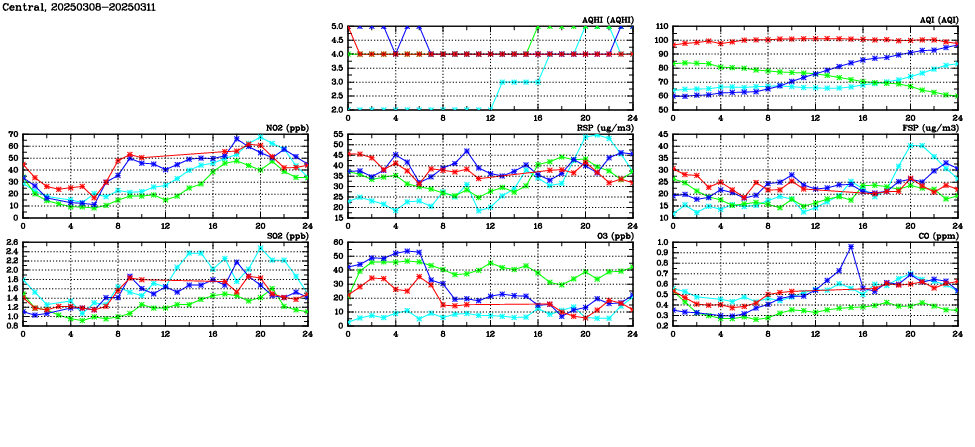 | Air Quality Data Time Series in Central (2025/03/11) | ( Line colors: Day -3 Day -2 Day -1 Current day ) | 2D Map Current AQHI |
