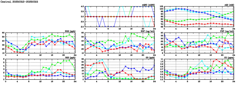 | Air Quality Data Time Series in Central (2025/03/15) | ( Line colors: Day -3 Day -2 Day -1 Current day ) | 2D Map Current AQHI |