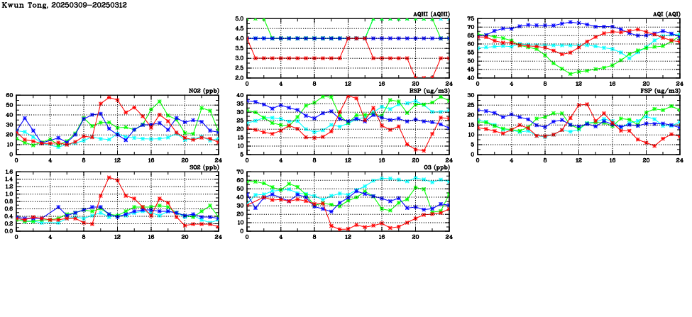 | Air Quality Data Time Series in Kwun Tong (2025/03/12) | ( Line colors: Day -3 Day -2 Day -1 Current day ) | 2D Map Current AQHI |