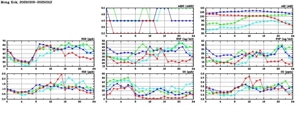 | Air Quality Data Time Series in Mong Kok (2025/03/12) | ( Line colors: Day -3 Day -2 Day -1 Current day ) | 2D Map Current AQHI |