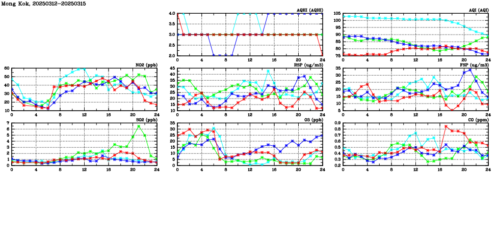 | Air Quality Data Time Series in Mong Kok (2025/03/15) | ( Line colors: Day -3 Day -2 Day -1 Current day ) | 2D Map Current AQHI |