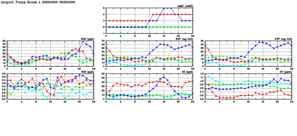 | Air Quality Data Time Series in Airport, Pump House 1 (2025/03/09) | ( Line colors: Day -3 Day -2 Day -1 Current day ) | 2D Map Current AQHI |