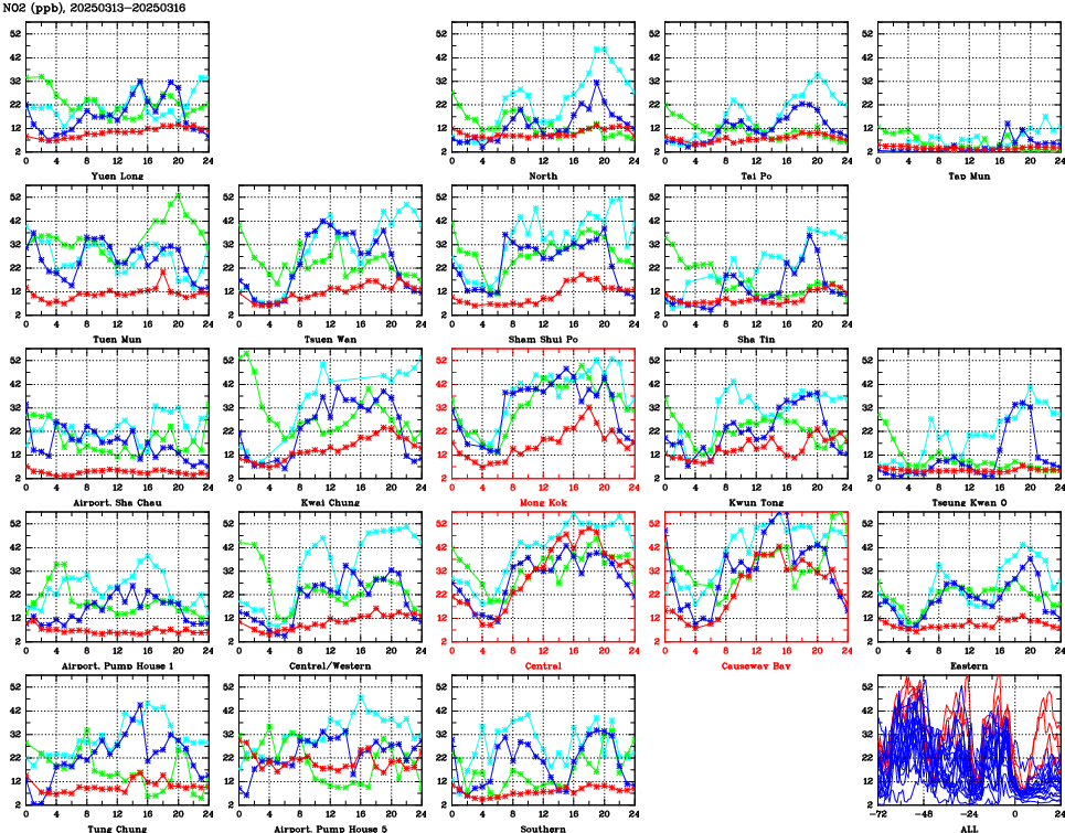 | Air Quality Data Time Series for NO2 (2025/03/16) | ( Line colors: Day -3 Day -2 Day -1 Current day ) | 2D Map Current AQHI |