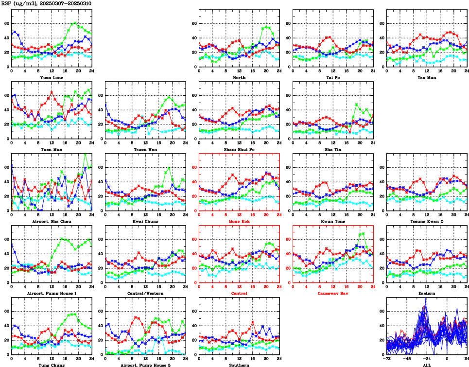 | Air Quality Data Time Series for RSP (2025/03/10) | ( Line colors: Day -3 Day -2 Day -1 Current day ) | 2D Map Current AQHI |