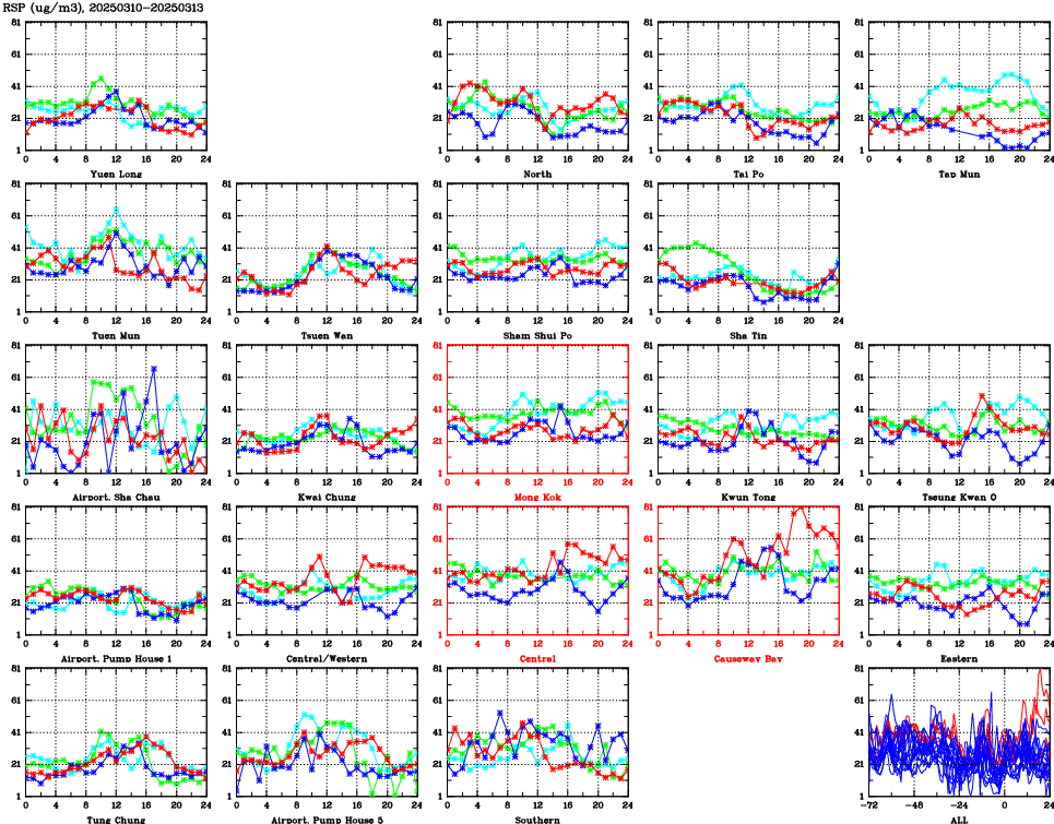 | Air Quality Data Time Series for RSP (2025/03/13) | ( Line colors: Day -3 Day -2 Day -1 Current day ) | 2D Map Current AQHI |