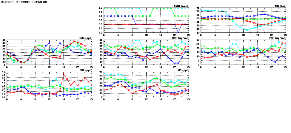 | Air Quality Data Time Series in Eastern (2025/03/13) | ( Line colors: Day -3 Day -2 Day -1 Current day ) | 2D Map Current AQHI |