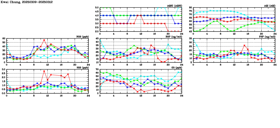 | Air Quality Data Time Series in Kwai Chung (2025/03/12) | ( Line colors: Day -3 Day -2 Day -1 Current day ) | 2D Map Current AQHI |