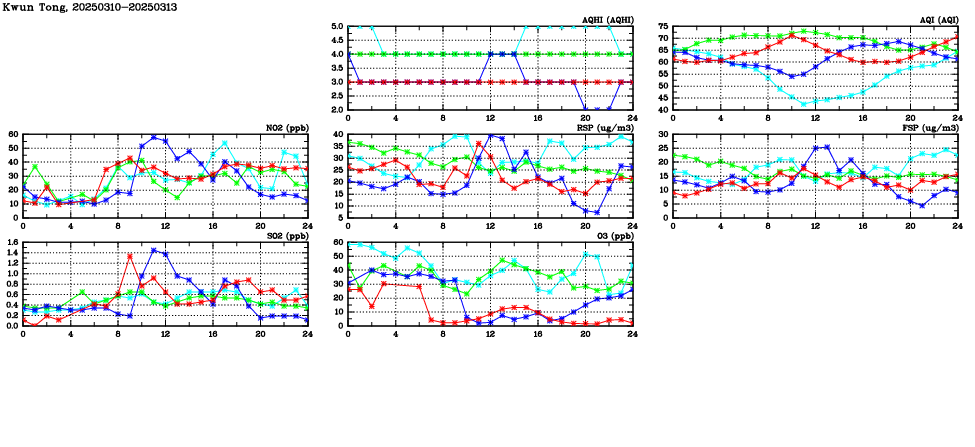 | Air Quality Data Time Series in Kwun Tong (2025/03/13) | ( Line colors: Day -3 Day -2 Day -1 Current day ) | 2D Map Current AQHI |
