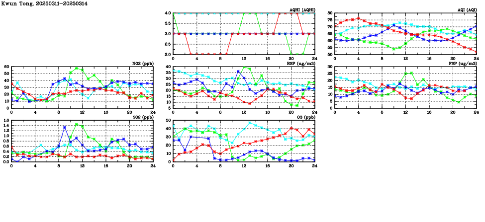 | Air Quality Data Time Series in Kwun Tong (2025/03/14) | ( Line colors: Day -3 Day -2 Day -1 Current day ) | 2D Map Current AQHI |