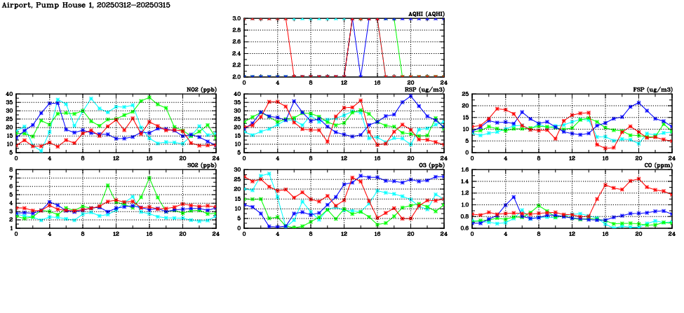 | Air Quality Data Time Series in Airport, Pump House 1 (2025/03/15) | ( Line colors: Day -3 Day -2 Day -1 Current day ) | 2D Map Current AQHI |