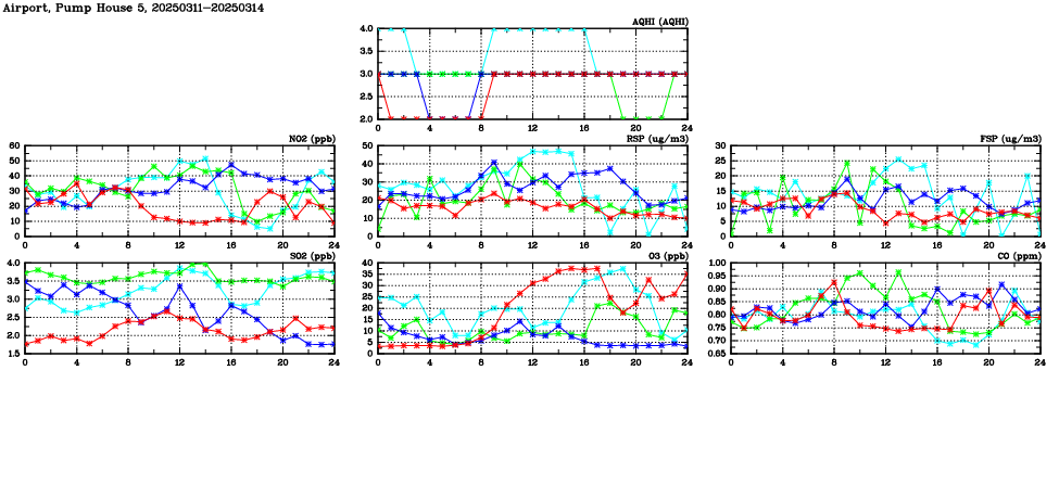 | Air Quality Data Time Series in Airport, Pump House 5 (2025/03/14) | ( Line colors: Day -3 Day -2 Day -1 Current day ) | 2D Map Current AQHI |