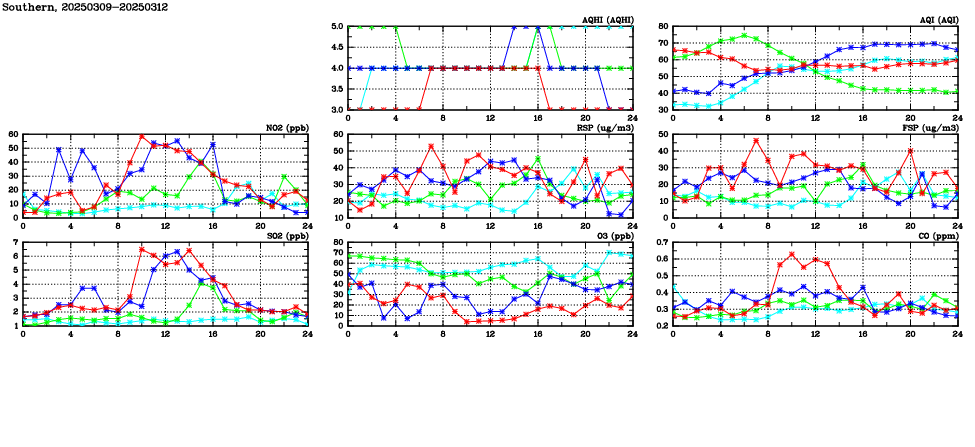 | Air Quality Data Time Series in Southern (2025/03/12) | ( Line colors: Day -3 Day -2 Day -1 Current day ) | 2D Map Current AQHI |