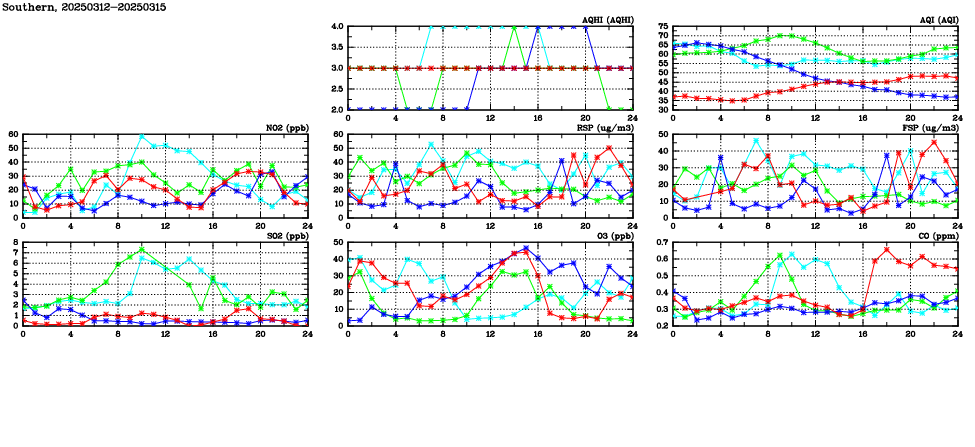 | Air Quality Data Time Series in Southern (2025/03/15) | ( Line colors: Day -3 Day -2 Day -1 Current day ) | 2D Map Current AQHI |