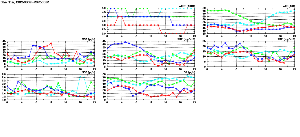 | Air Quality Data Time Series in Sha Tin (2025/03/12) | ( Line colors: Day -3 Day -2 Day -1 Current day ) | 2D Map Current AQHI |
