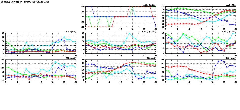 | Air Quality Data Time Series in Tseung Kwan O (2025/03/16) | ( Line colors: Day -3 Day -2 Day -1 Current day ) | 2D Map Current AQHI |