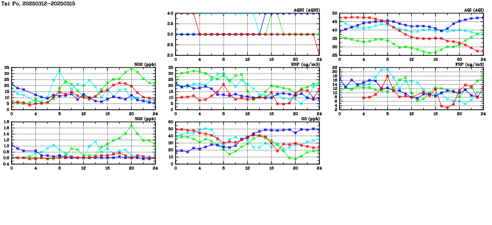 | Air Quality Data Time Series in Tai Po (2025/03/15) | ( Line colors: Day -3 Day -2 Day -1 Current day ) | 2D Map Current AQHI |