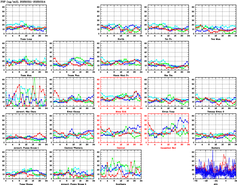 | Air Quality Data Time Series for FSP (2025/03/14) | ( Line colors: Day -3 Day -2 Day -1 Current day ) | 2D Map Current AQHI |