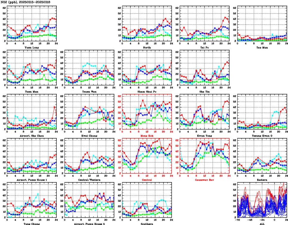 | Air Quality Data Time Series for NO2 (2025/03/18) | ( Line colors: Day -3 Day -2 Day -1 Current day ) | 2D Map Current AQHI |